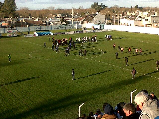 Una de las preocupaciones principales para la dupla era el terreno de juego, que debido a sus pequeñas dimensiones, haría que las jugadas a balón parado supusieran un peligro constante para el arco aurinegro. Dicho y hecho, en una pelota detenida Villa San Carlos se encontró con el primer grito de la tarde en la única chance. Mauro Dobler perdió el dominio del balón y le dejó servido el tanto al capitán Federico Slezack cuando iban 30 minutos.